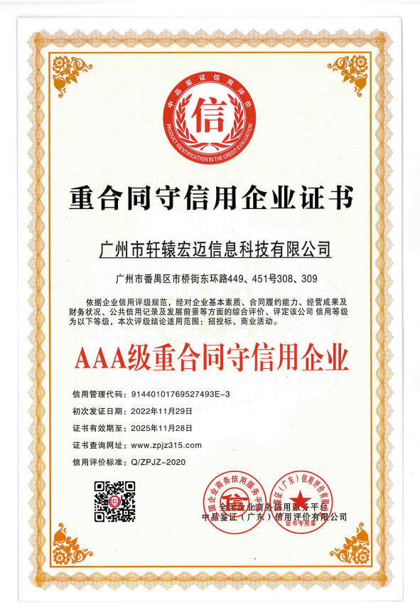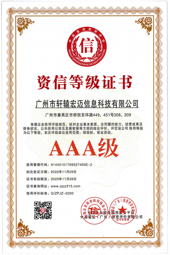 AAA級企業信用等級證書